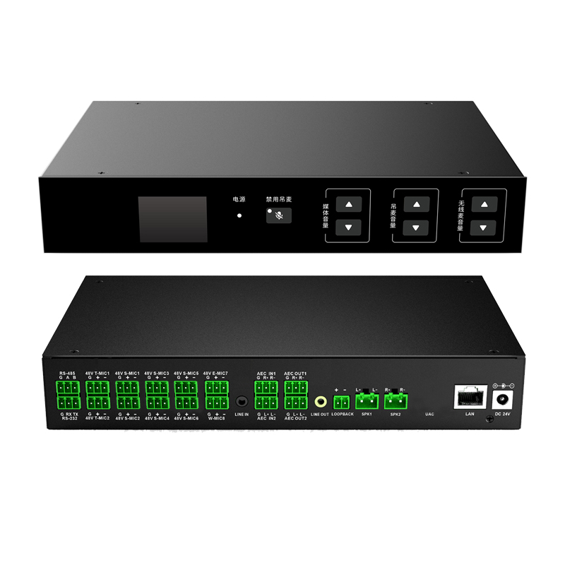 高度集成设计,功能全面:该终端设计精密,集成了音频采集、无感声音补偿、功放等多项功能,支持AI智能降噪、自动增益、啸叫抑制、语音增强、声场自适应和低延迟等技术,为用户提供全面的音频解决方案。